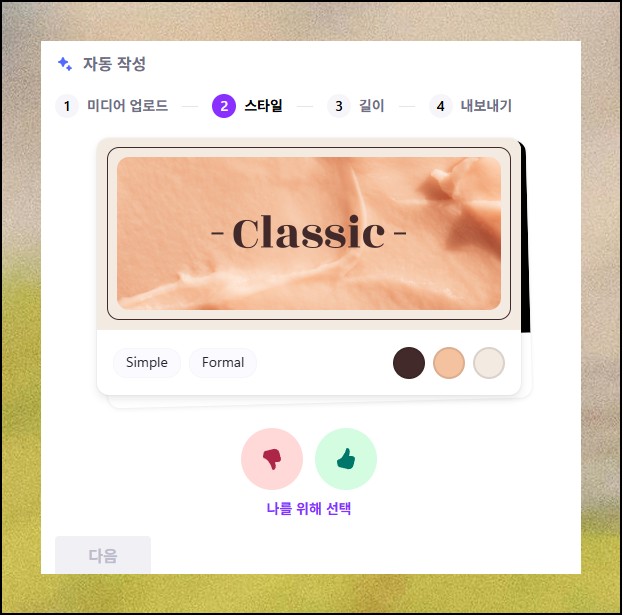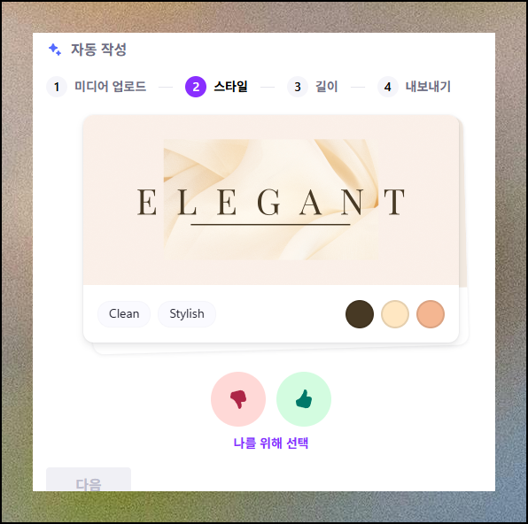 두 번째는 디자인 선택 단계입니다. 복잡한 편집 과정 없이 마음에 드는 옵션을 고르기만 하면 됩니다. 시스템이 자동으로 선택한 스타일에 맞춰 동영상을 만들어줘요.