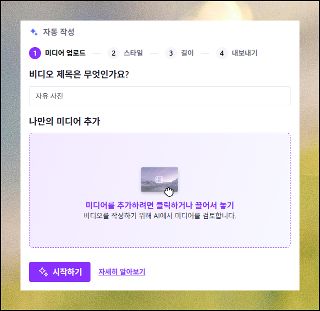 동영상 만들기 작업은 크게 4단계로 진행됩니다. 첫 번째는 이미지 업로드 단계입니다. 작품 제목을 입력하고 준비한 자료들을 추가하세요.