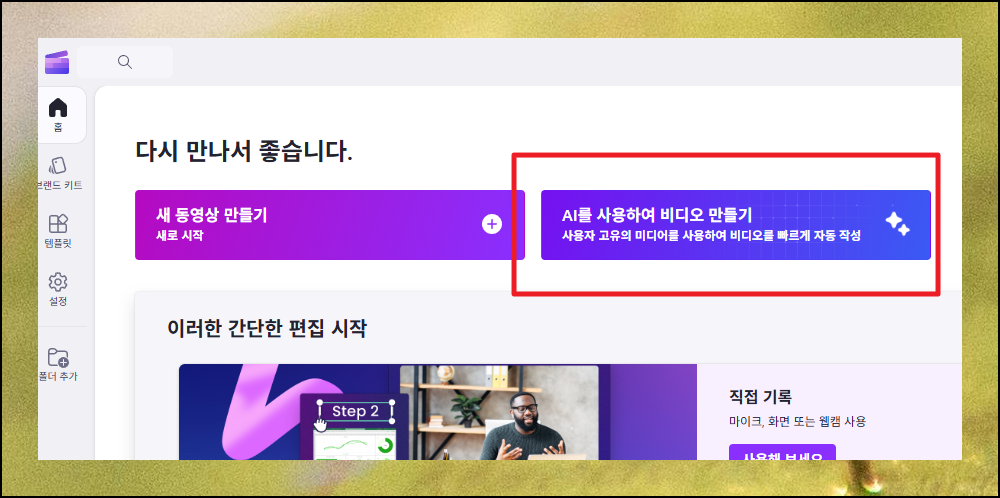 소프트웨어를 실행하면 두 가지 방식이 나타납니다. 'AI를 사용하여 비디오 만들기' 기능을 선택하면 처음부터 설정하는 것보다 훨씬 빠르게 사진으로 동영상 만들기 진행을 할 수 있어요.