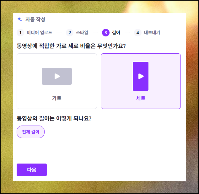 세 번째는 화면 비율 선택 단계예요. 최근에는 숏폼 콘텐츠가 인기이므로 세로로 긴 형태의 영상이 대세입니다. 이 형식을 선택한 후 '다음' 버튼을 클릭하세요.