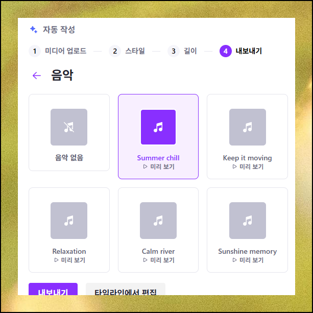 마지막은 마무리 단계로, 여기서 배경음악을 선택할 수 있습니다. 클립챔프에서 제공하는 다양한 오디오 중에서 고를 수 있어요. 사진을 이용한 동영상 제작에는 적절한 배경음악이 필수적입니다.