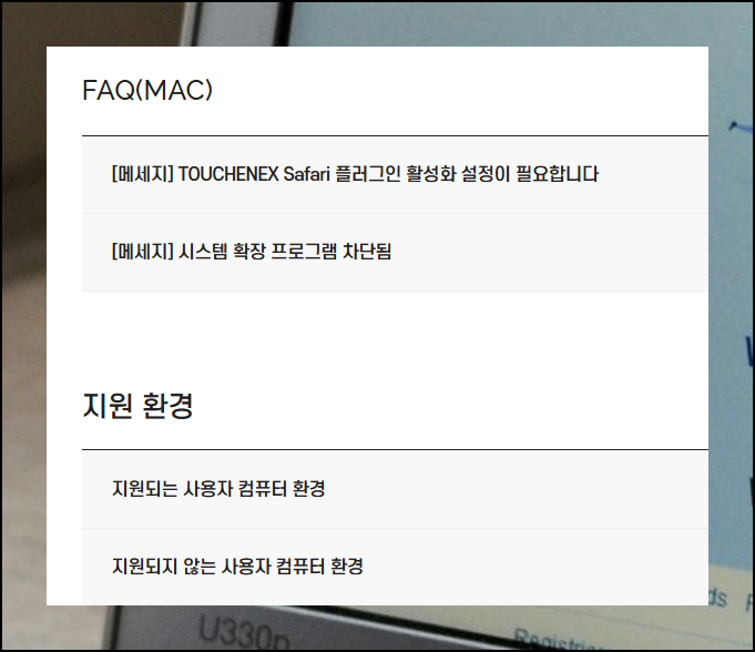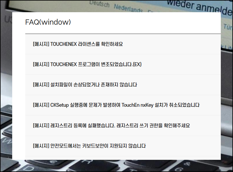 윈도우나 맥북 등 운영체제별로 FAQ가 구분되어 있어요. 발생한 오류 메시지에 따라 해결 방안을 안내해줍니다. TOUCHENEX 라이센스 확인, 프로그램 변조, 파일 손상, 레지스트리 등록 실패 등 다양한 장애가 생길 수 있는데요.