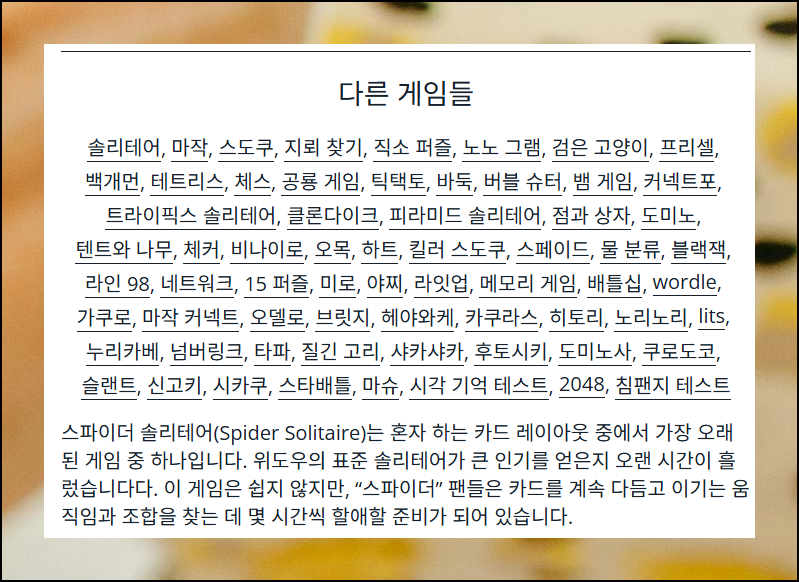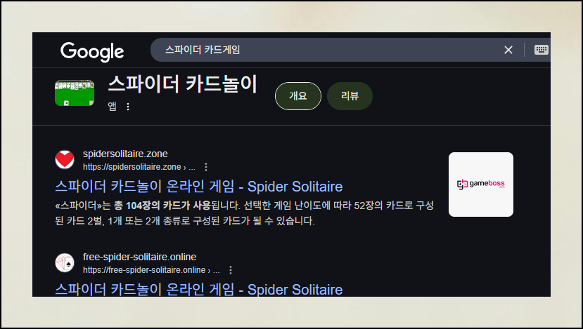 구글에서 "스파이더 카드놀이"를 검색하면 한글로 된 웹사이트를 쉽게 찾을 수 있어요. 원하는 링크나 이미지를 클릭하면 바로 메인화면으로 이동합니다. 다운로드 없이 바로 바로 게임을 즐길 수 있어 편리해요.