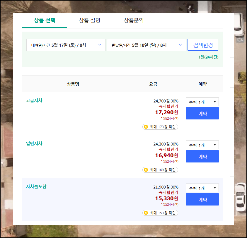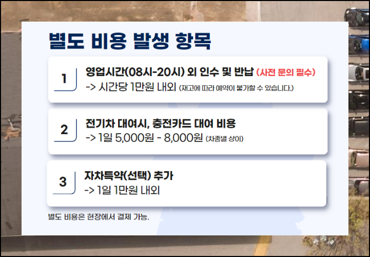 기본 요금과 완전자차 요금이 합리적이어서 저렴한곳을 찾는 방문객에게 적합해요. 쿠팡 같은 비교 사이트에서 조건을 검토하면 더 좋은 혜택을 찾을 수 있습니다.