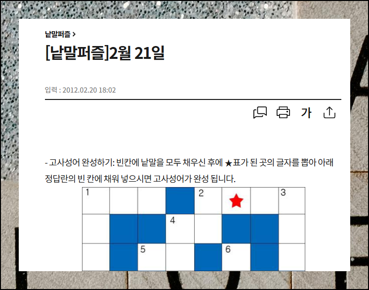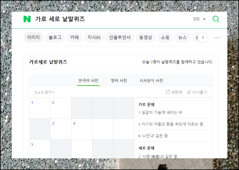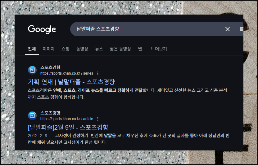 두 번째로 추천하는 서비스는 스포츠경향 신문의 가로 세로 단어 퀴즈입니다. "낱말퍼즐 스포츠경향"으로 검색하면 쉽게 접근할 수 있어요.