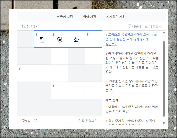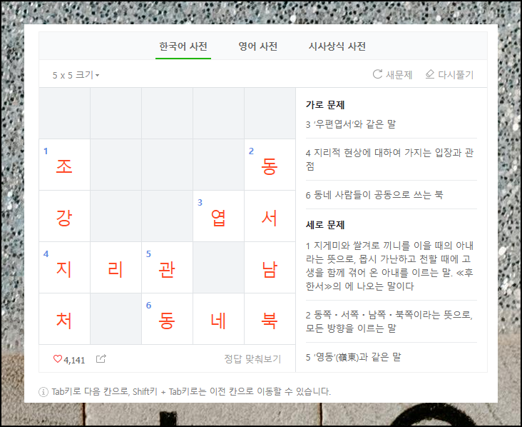 네이버의 낱말 퍼즐은 다양한 난이도와 주제가 준비되어 있어요. 5x5 크기부터 10x10까지 다양하며, 세 종류의 사전을 활용한 문제들이 있습니다. 마우스로 칸을 선택해 답을 입력하거나, Tab키로 이동하며 편리하게 풀 수 있어요.