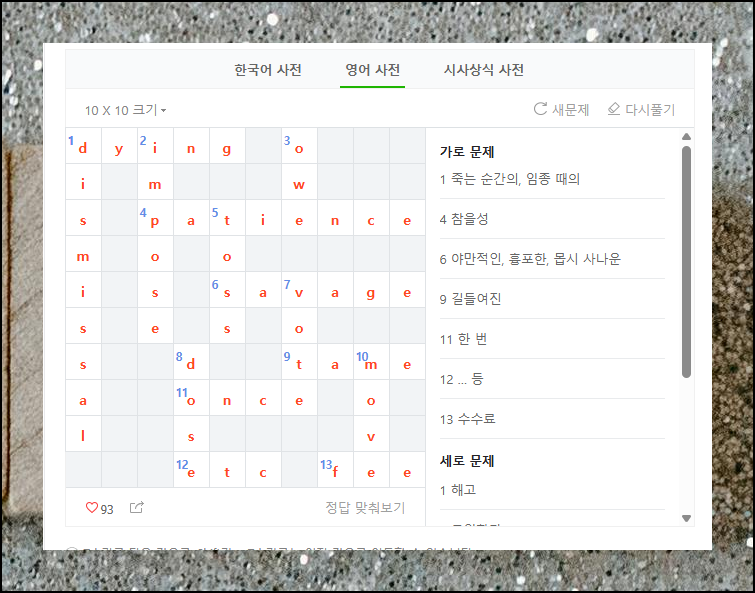 이 서비스를 통해 영어 실력도 향상 시킬 수 있습니다. 영어 사전 맞추기 게임을 통해 지루한 어휘 학습을 재미있게 할 수 있어요. 오른쪽에 제시된 문제를 읽고, 해당하는 단어를 입력하는 방식을 사용해 보세요.