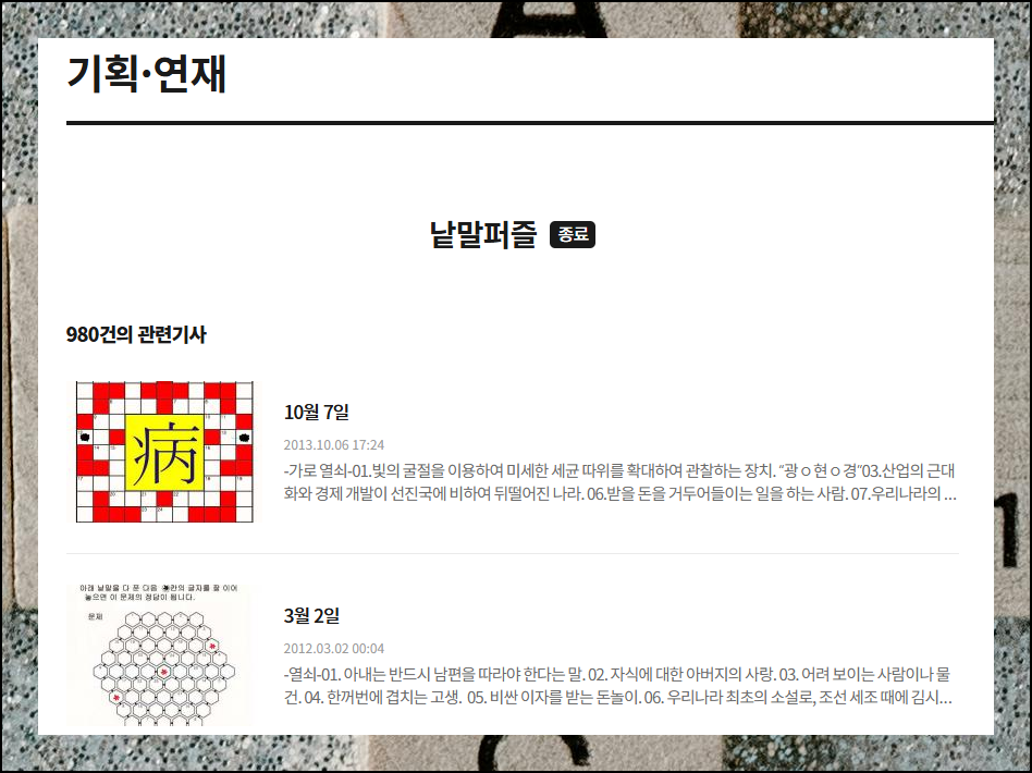 스포츠경향 사이트는 과거에 연재된 세로 가로 퀴즈들을 제공합니다. 시간이 지났어도 단어의 본질은 변하지 않아 여전히 유효한 학습 자료로 활용할 수 있어요. 직사각형 구성 외에도 다른 모양의 낱말맞추기 게임도 할 수 있습니다.