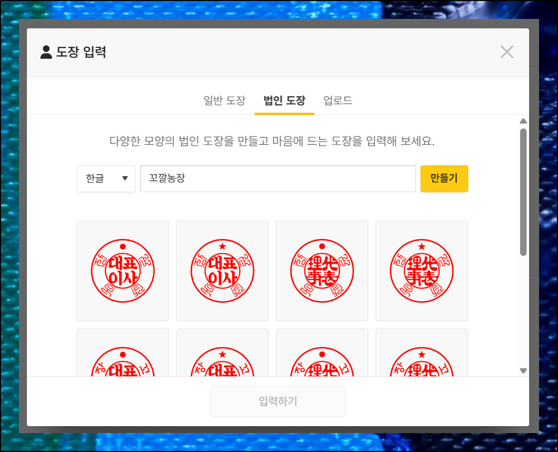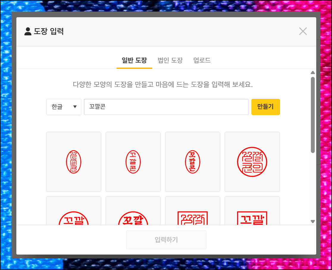 이제 마지막 단계예요. 마음에 드는 스타일을 정했다면 입력하기 버튼을 눌러주세요. 그러면 전자서명 제작이 완료됩니다. 앞서 보여드린 전자서명이 바로 이 과정을 통해 개발된 결과물이에요.