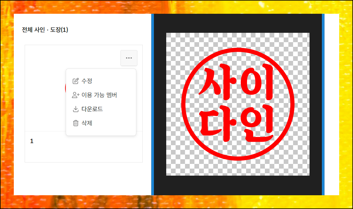 관리 페이지에 들어왔어요. 왼쪽에 여러 메뉴들이 나열되어 있네요. 이 중에서 싸인과 도장 관련 메뉴를 클릭해주세요. 그러면 오른쪽에 도장 생성할 수 있는 화면이 나타나요.