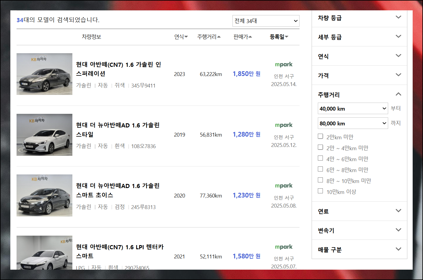 주행거리 4만~8만 킬로미터 구간의 아반떼를 검색해봤어요. 비슷한 조건의 아반떼 중고차 매물이 대부분 1천만원 초중반대에서 가격이 형성되고 있었습니다.