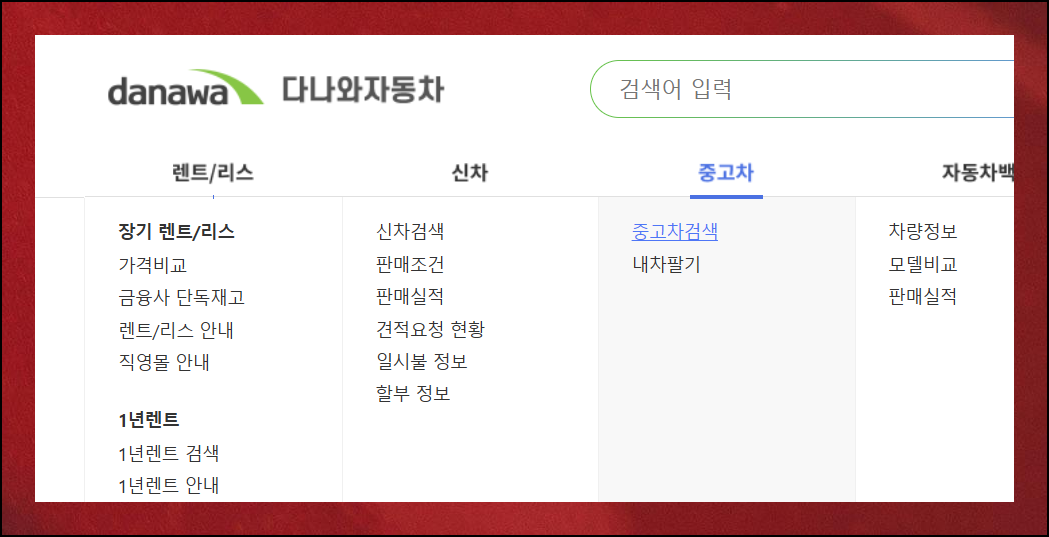 다나와 자동차 플랫폼 메뉴에서 '중고차 검색' 부분을 찾아 클릭해주세요. 메인 화면에서 쉽게 눈에 띄는 위치에 있으니 금방 찾을 거예요.