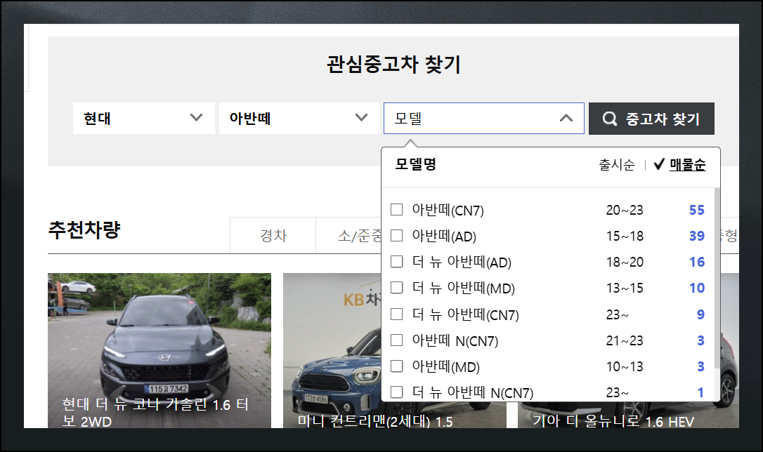 검색 페이지에서 현대 아반떼를 찾아주세요. 출시년도에 따라 여러 세대로 나뉘는데요. 매물이 많은 세대를 선택하는 것이 중고차 시세표를 보는 데에 있어서 유리합니다.