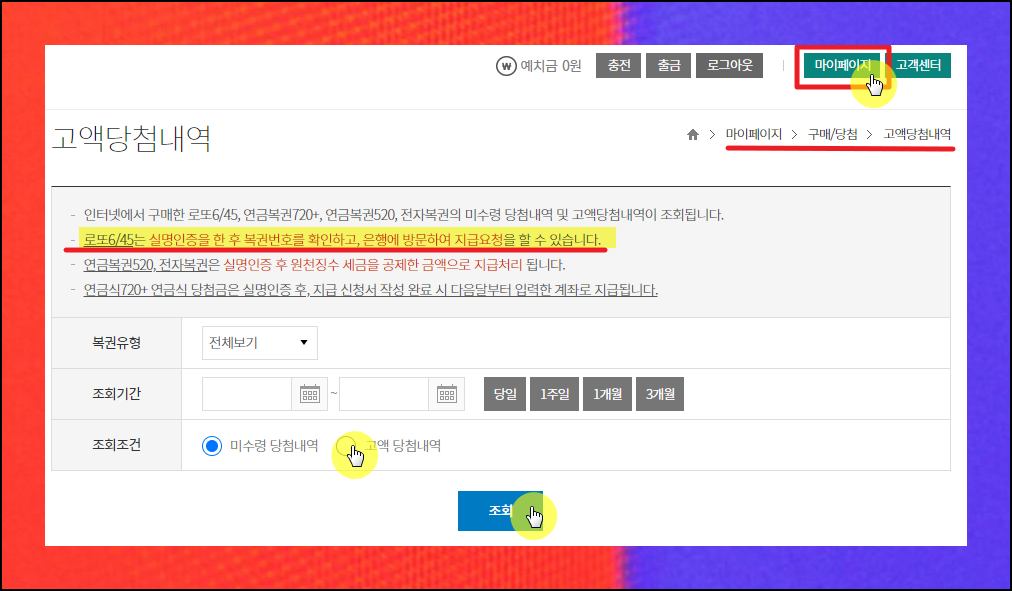 요즘에는 동행복권 웹사이트를 통해서 복권 구입이 가능한데요. 해당 사이트에서 구입한 로또 복권이 3등으로 나왔다면 개인 계정의 마이페이지에서 고액당첨내역 메뉴를 찾아보세요.