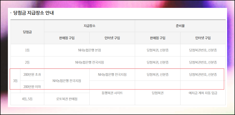 참고로 로또 4등이나 5등에 당첨이 된 경우라면 구입 방법에 따라 판매점 또는 동행복권 홈페이지에서 수령이 가능합니다. 혹시 로또 1등에 해당되신다면 NH농협은행 본점에서만 받을 수 있다는 점도 기억해 두세요.