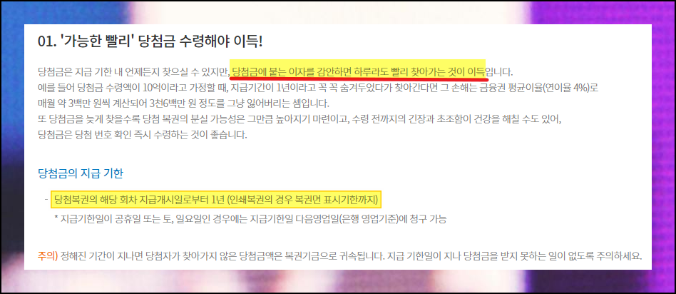 로또 3등에 해당되었지만 업무가 바빠서 NH지점 방문을 미루게 될 수 있어요. 하지만 꼭 알아두셔야 할 중요한 내용이 있습니다. 수령방법 중에서도 시기가 가장 중요해요. 가능한 한 서둘러서 하는 것이 유리합니다.