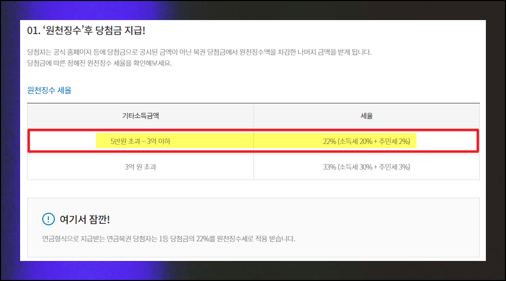 이 경우 납부하게 되는 세금은 소득세 20%와 지방소득세 2%입니다. 만약 금액이 3억원을 초과한다면 세금 비율이 33%로 올라가요. 세금 부담이 상당하지만, 그래도 한 번 쯤은 이러한 기쁨을 맛보고 싶네요.