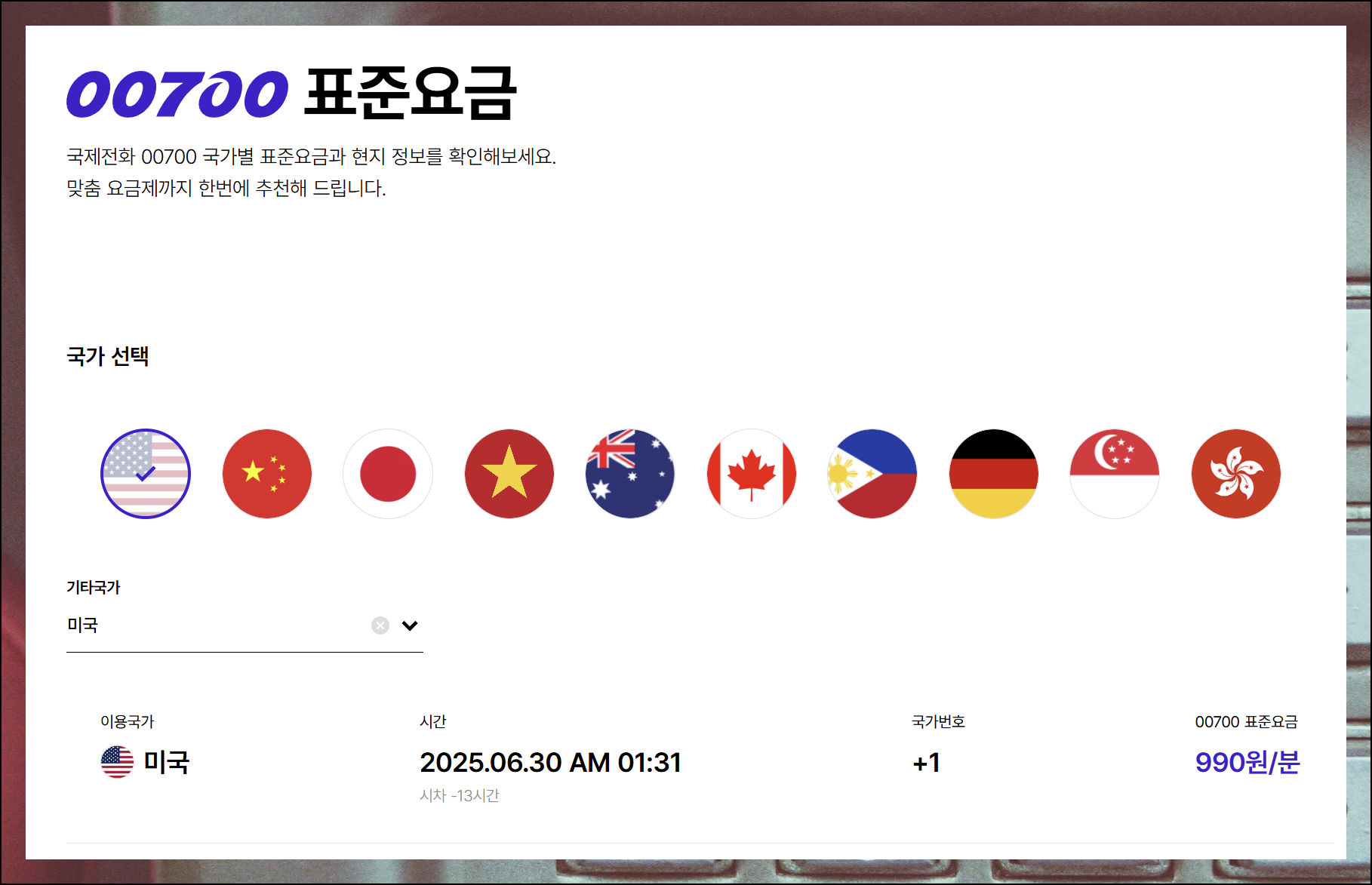 통화 음질의 경우 최근에는 모든 서비스가 상당히 개선되어서 품질 면에서는 큰 차이가 없어요. 현재 기준으로 보았을 때 00700을 이용하여 미국으로 국제전화를 거는 경우 1분당 990원의 요금이 발생한다고 합니다.