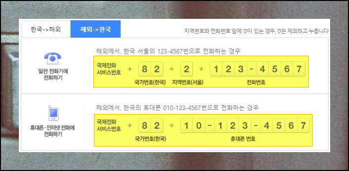 당연히 미국에서 한국으로 전화를 걸어야 하는 상황도 있겠죠. 이때는 앞서 설명한 방법에서 국가코드만 바꿔주면 되니까 어렵지 않아요. 미연방 국가코드 1번 대신 한국 국가코드 82번을 사용하면 됩니다. 우리나라는 국제적으로 82번을 배정 받아 사용하고 있거든요. 휴대폰 번호로 거는 경우 한 가지 주의사항이 있어요. 국내에서 사용하던 방식과 달리 맨 앞자리 0을 제거해야 해요.