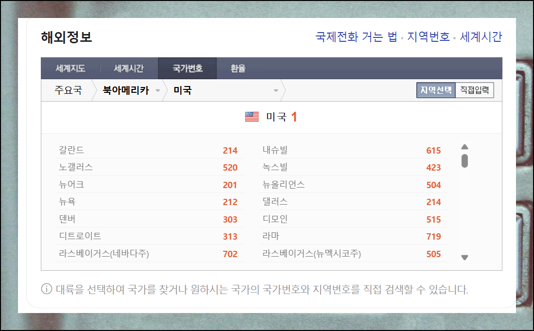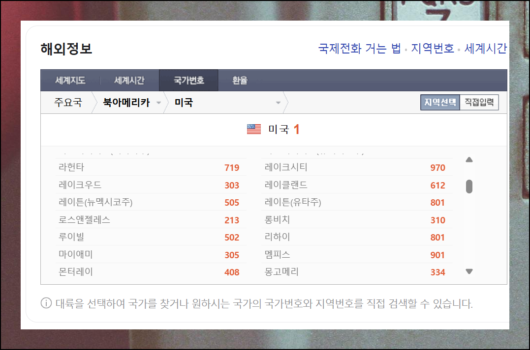 국가코드 페이지에서 미국를 선택하면 전국 각 지역의 번호를 한눈에 확인할 수 있습니다. 갈란드 지역은 214번, 노갤러스는 520번, 뉴욕은 212번, 디모인은 515번, 라마는 719번을 사용해요. 이런 식으로 각 도시와 지역마다 고유한 식별번호가 배정되어 있으니까 통화 전에 미리 확인해두면 실수 없이 연결할 수 있어요.