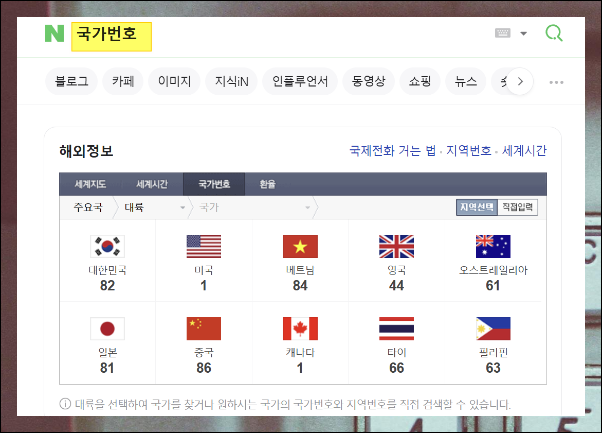 미국의 각 지역코드를 찾는 가장 쉬운 방법을 알려드릴게요. 네이버 검색창에 "국가번호"라고 입력해보세요. 검색 결과에는 우리나라를 포함해서 베트남, 영국, 타이, 필리핀, 캐나다, 중국, 일본, 오스트레일리아 등 전세계 주요 국가들의 번호가 나타나요. 이 목록에서 미국 국기를 클릭하면 더 자세한 정보를 볼 수 있어요.