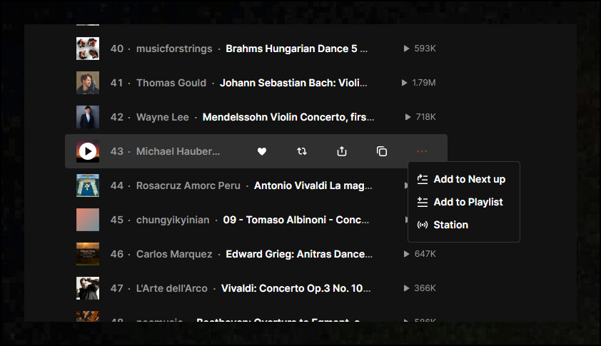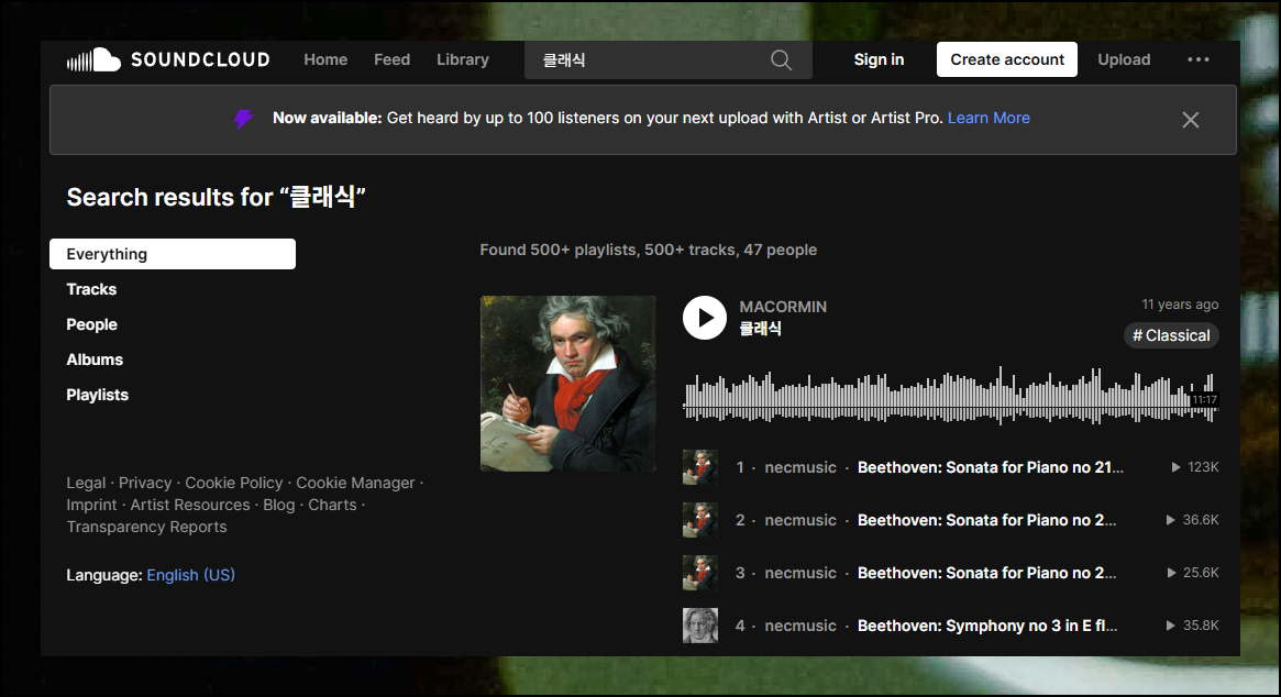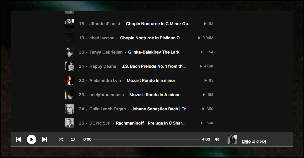 개인적으로 클래식을 검색해봤는데요. 정말 놀라운 결과가 나왔어요. 무료로 접근할 수 있는 콘텐츠가 엄청나게 많더라고요. 플레이리스트는 일종의 모음집이라고 할 수 있는데요. 꽤 많은 곡이 하나의 모음으로 묶여 있는 것입니다. 이런 모음집을 클릭하면 여러 곡을 연속으로 감상할 수 있어요.