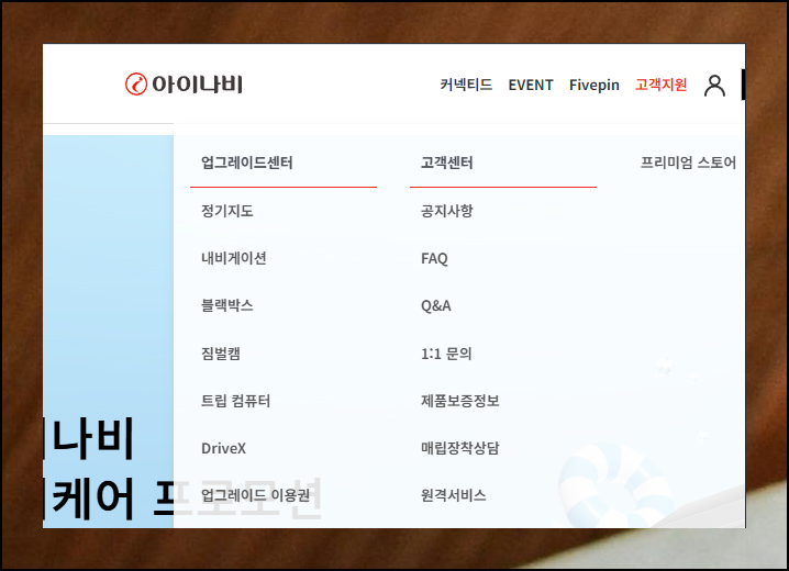 아이나비 홈페이지에 들어가면 화면 우측 상단 부분에 고객지원이라는 메뉴가 있습니다. 이 메뉴를 클릭하면 여러 하위 메뉴들이 펼쳐져요. 업그레이드 센터 카테고리를 찾아보세요. 그 카테고리 안에서 두 번째에 위치한 내비게이션 메뉴를 선택하면 됩니다.