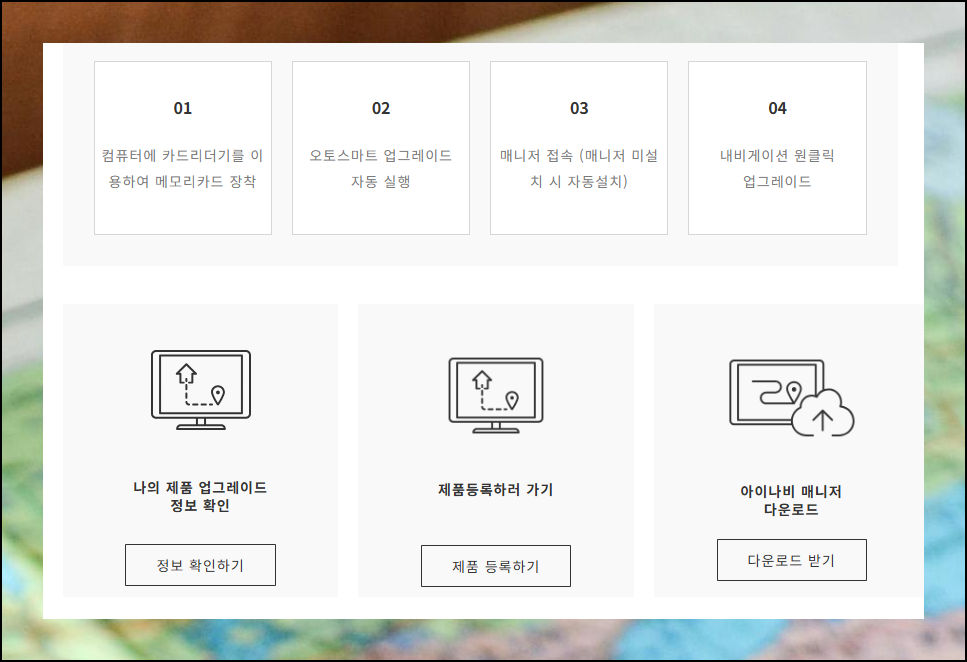 내비게이션 업그레이드는 정해진 순서를 따라야 해요. 카드리더기를 통해 메모리카드를 컴퓨터에 연결하는 것부터 시작하니다. 그러면 오토스마트 업그레이드가 자동으로 실행되고, 매니저 소프트웨어를 실행해서 접속한 후 내비게이션 원클릭 업그레이드를 진행하면 됩니다. 화면에서 아이나비 매니저 다운로드 버튼을 찾아 클릭하세요. 참고로 소프트웨어를 설치하기 전에 나의 제품 정보 확인 버튼을 눌러서 내비게이션 기기에 대한 제품 정보를 미리 확인해보는 것이 좋아요.