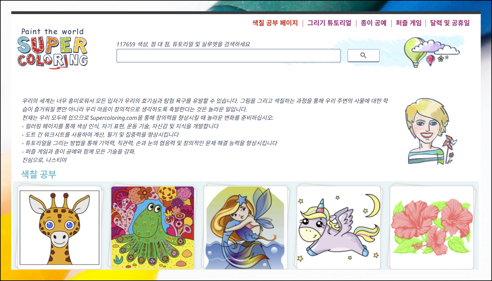 홈페이지 주소 뒤에 "/KO"를 추가하면 한글 사이트로 바뀝니다. 또는 브라우저에서 한국어로 변경하는 기능을 사용해보세요. 이렇게 하면 한국어로 편리하게 이용할 수 있습니다. 그럼 색칠공부 자료를 구하기 위해 '색칠공부 페이지' 메뉴를 클릭해주세요.