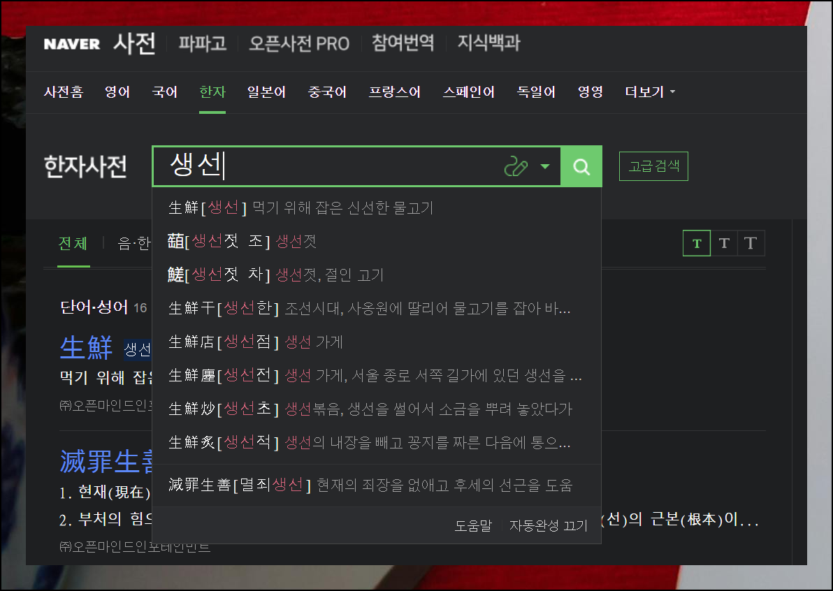 한자를 직접 타이핑하는 게 어렵다면 필기인식 기능을 써보세요. 검색 버튼 옆에 있는 아이콘을 클릭하면 이용할 수 있어요. 마우스로 문자의 모양을 그리기만 하면 인식해줍니다.
