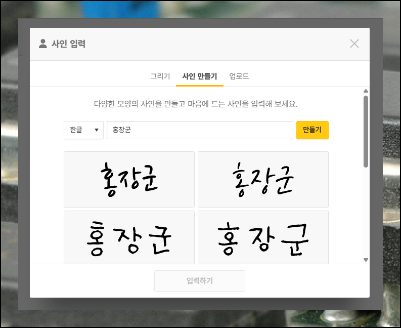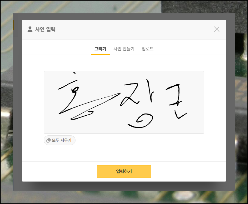 사인 제작에는 두 가지 방법이 있어요. 그리기 방식과 입력 방식 중에서 선택할 수 있습니다. 앞서 보여드린 것은 키워드 입력 방식이었어요. 이번에는 그리기 방식을 사용해보겠어요. 메뉴에서 그리기 버튼을 클릭한 후 빈 공간에 마우스로 사인을 그려보세요.
