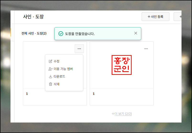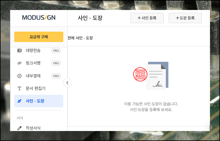 로그인하면 관리 페이지가 나타나요. 왼쪽 메뉴를 살펴보면 사인과 도장 만들기 메뉴가 있어요. 이 메뉴를 클릭하면 우리가 찾는 프로그램을 만나볼 수 있습니다. 사인 및 도장 등록을 하는 버튼이 보이는데, 이 버튼을 눌러서 본격적인 제작을 시작할 수 있어요.