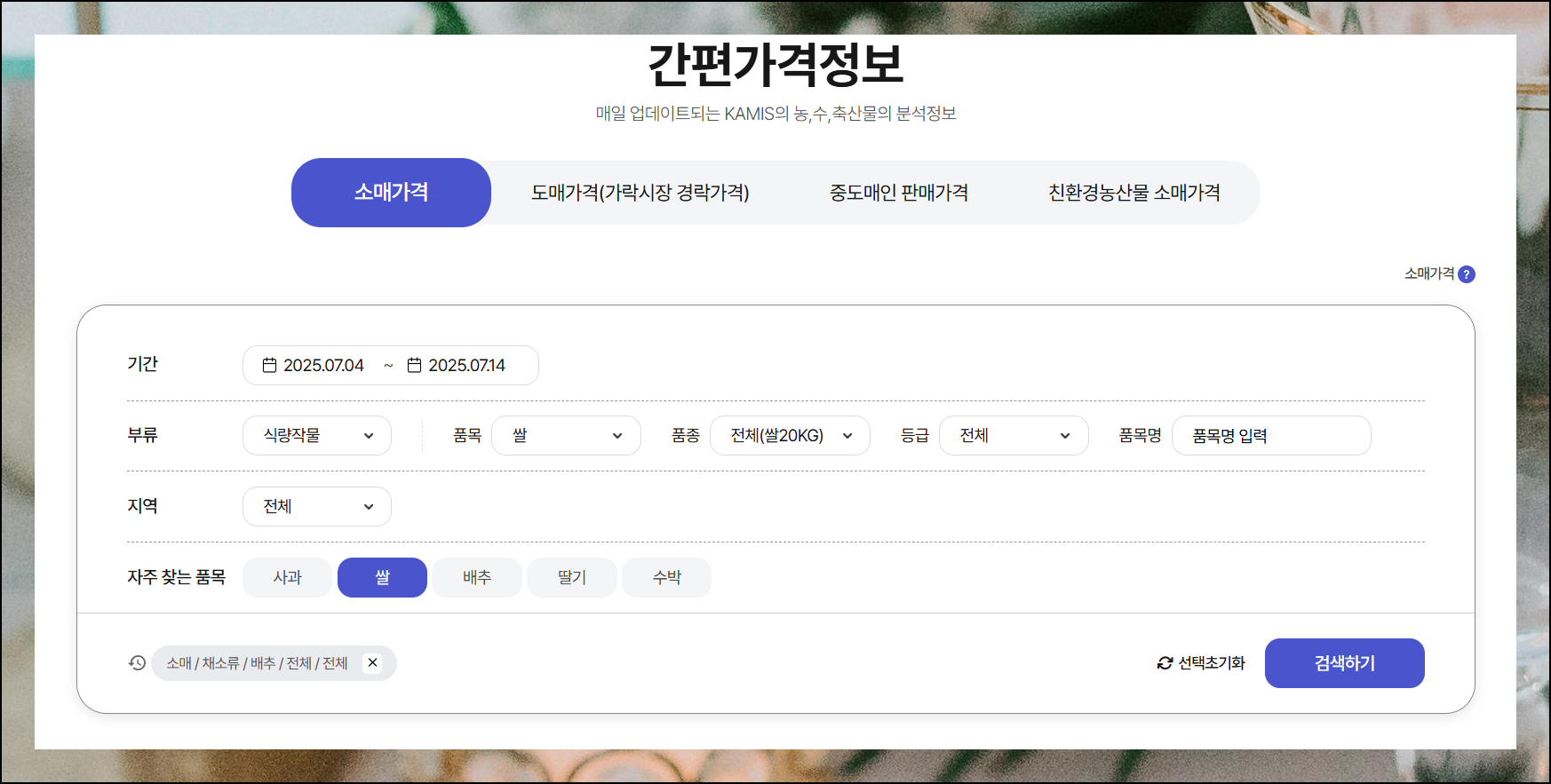 정부에서 운영하는 공식 사이트를 통해 실시간으로 업데이트가 되는 도매 및 소매가격을 동시에 확인할 수 있어요. 뿐만 아니라 과거 데이터와 비교 분석까지 가능해서 가격 흐름을 한눈에 파악할 수 있습니다.