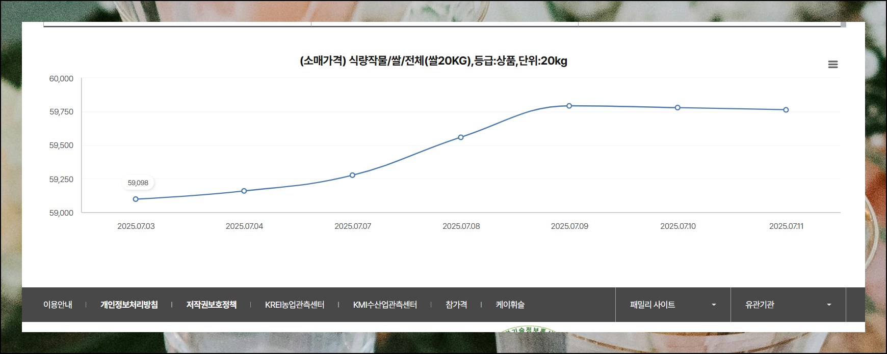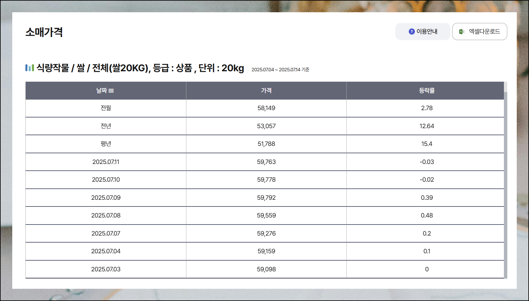 국내에서 가장 중요한 농산물인 쌀에 대한 시세를 조회해보았어요. 20kg 단위로 계산했을 때 작년 동기와 비교해서 살짝 올랐네요. 너무 소폭 올라서 크게 신경 쓸 정도는 아닙니다. 실제로 시세를 조회해보면 일부 식품들은 이전 시기보다 가격이 내려가는 경우도 있습니다.