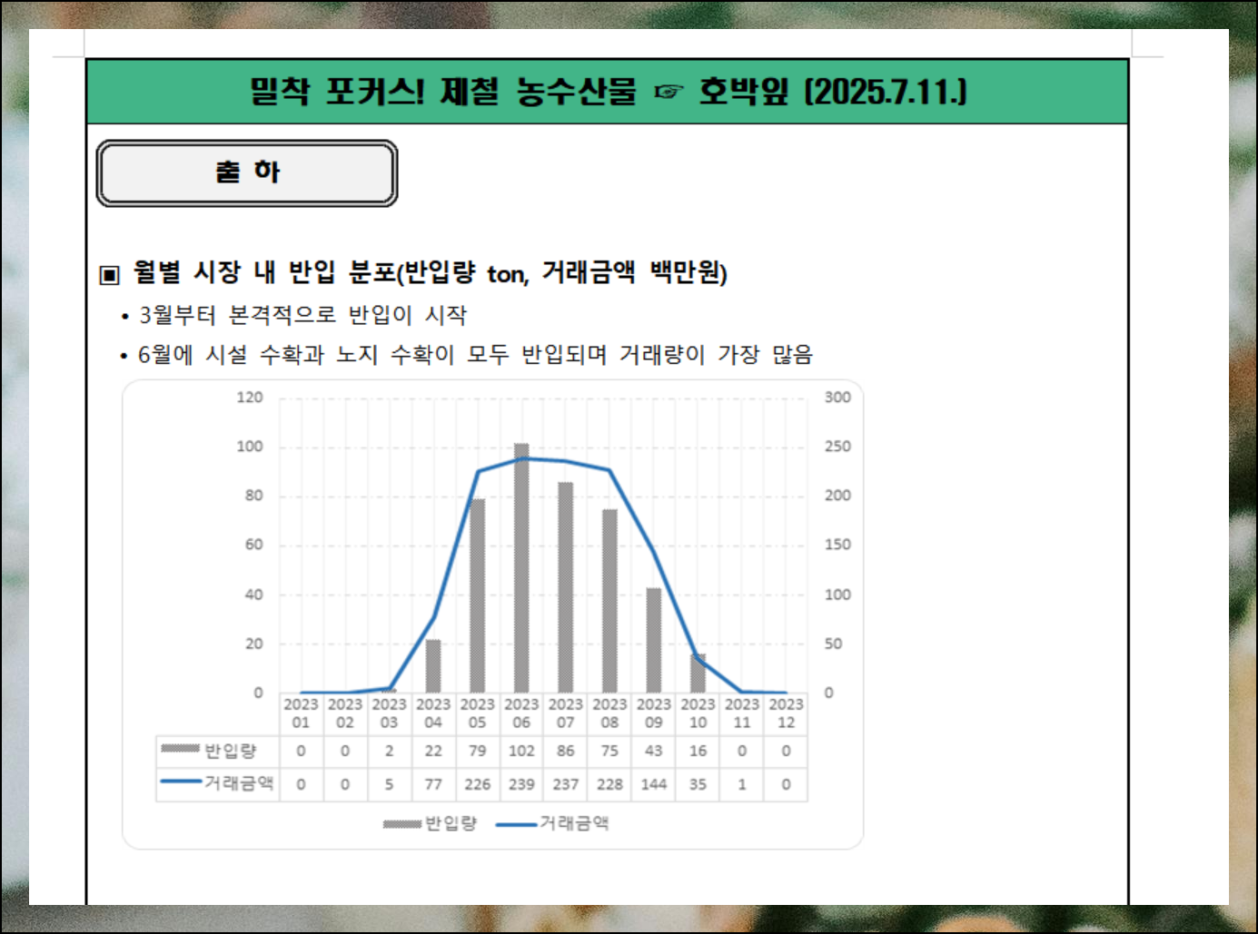 파일을 열어보면 제철 시기의 작물에 대한 풍부한 정보를 확인할 수 있어요. 그 중에서도 호박잎에 대한 구체적인 금액이 포함되어 있습니다. 월별 시장 내 반입 분포라던가 영양성분이나 효능 등 알찬 정보가 많이 들어 있어요.
