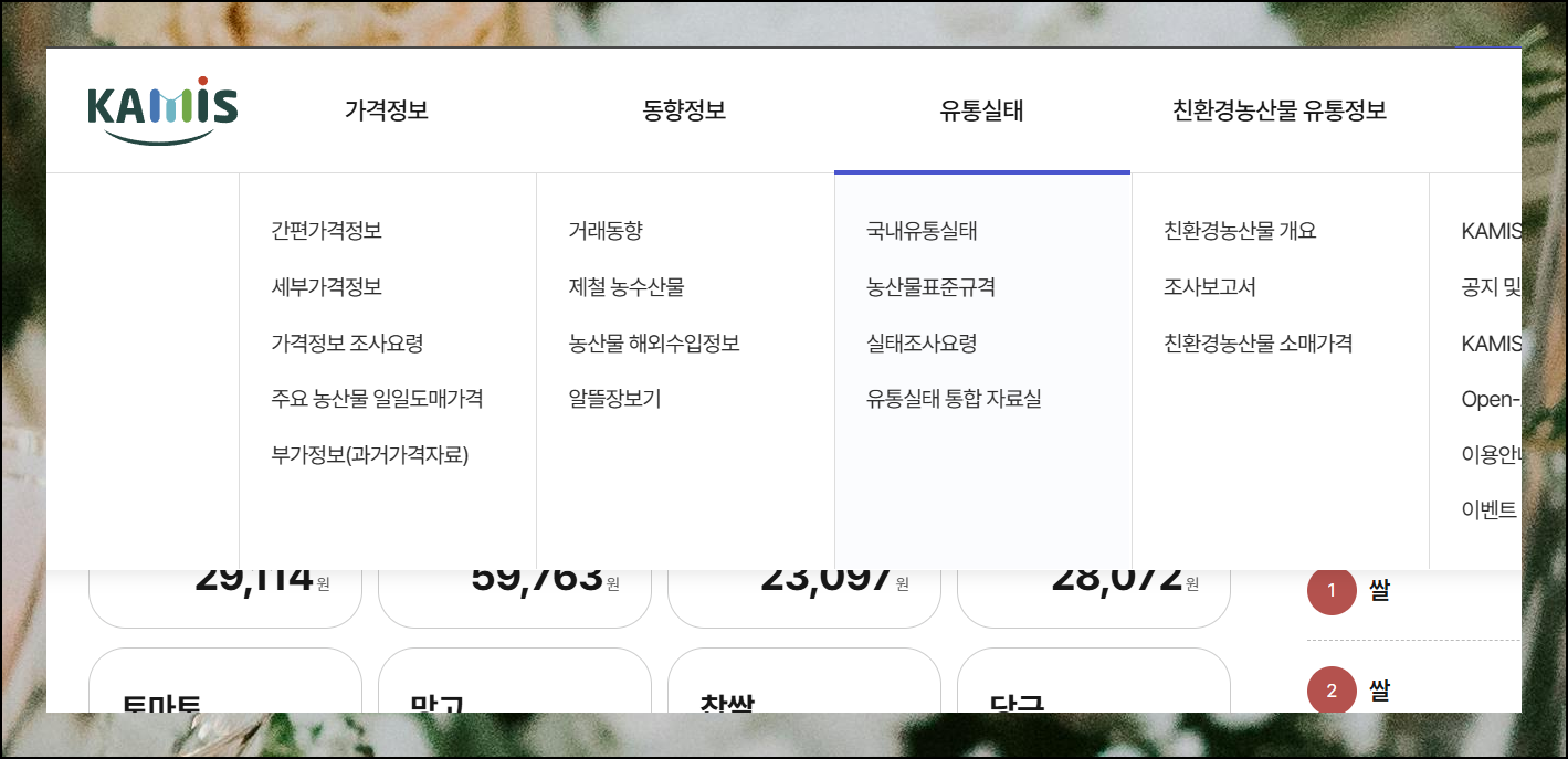 농산물 가격을 알아보는 가장 정확한 방법을 바로 알려드릴게요. KAMIS라는 사이트에 들어가면 모든 정보를 얻을 수 있습니다. 이곳에서는 농산물만이 아니라 생선류, 육류까지 다양한 식품에 대한 정보를 제공하고 있어요.