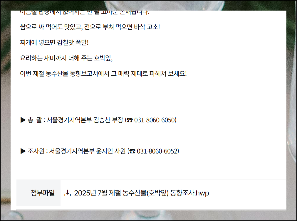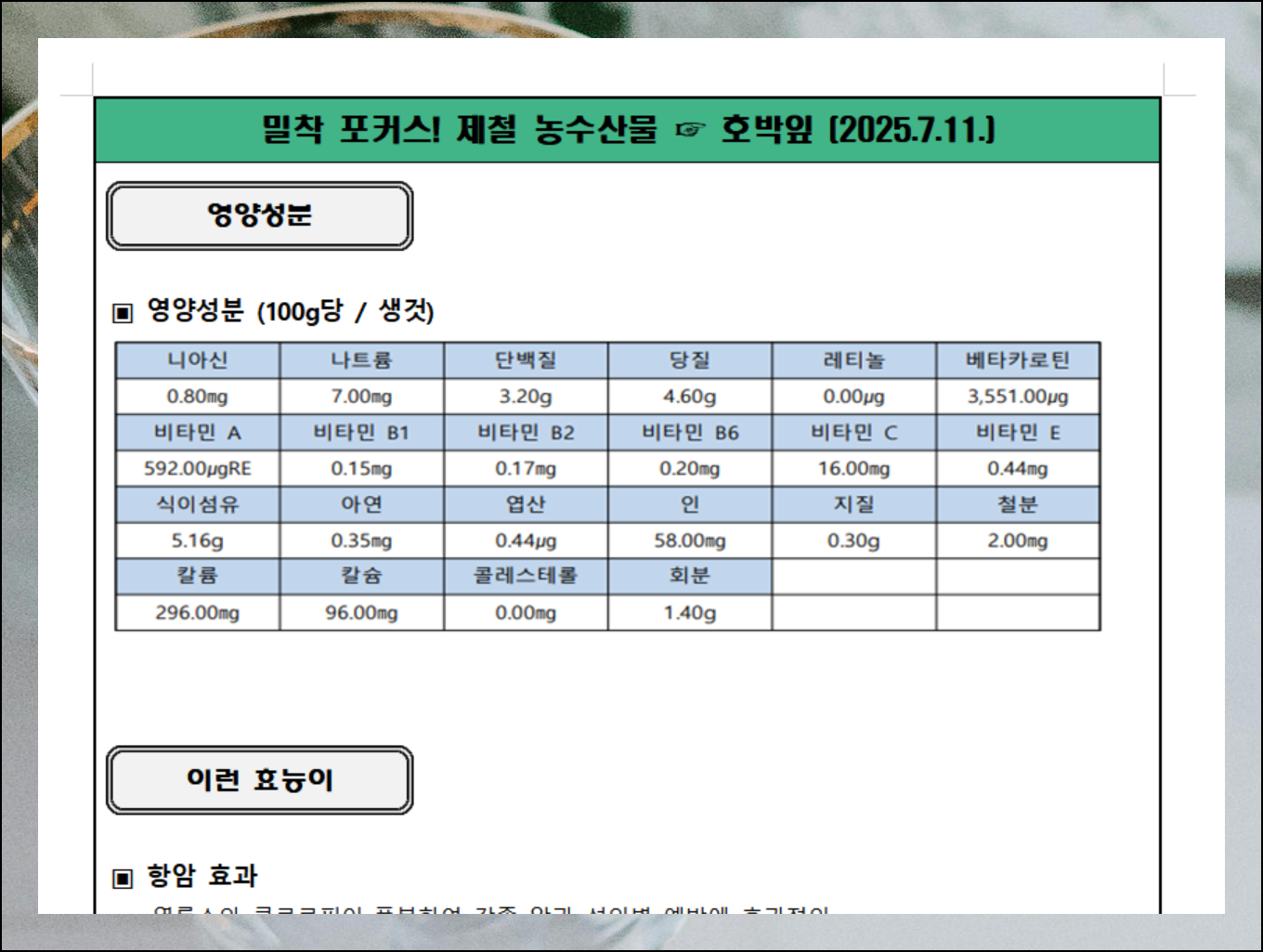 제철작물 중에서 호박잎을 선택해서 살펴보았습니다. 이렇게 더운 여름 철에는 호박잎을 통해 건강을 챙길 수 있어요. 숨은 영양제라고 할 정도로 건강에 좋다고 합니다. 들어 있는 영양소도 많고, 피부에도 좋다고 해요. 해당 게시물을 열어보면 첨부된 파일을 발견할 수 있습니다. 더 상세하게 확인할 수 있어요.
