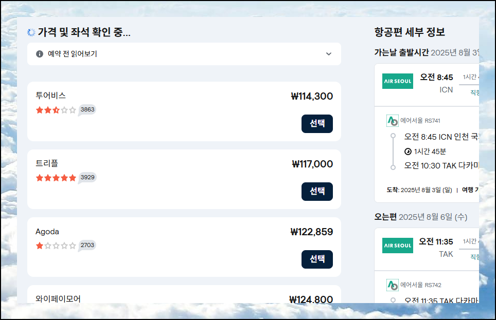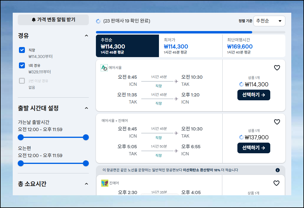 특정 항공편을 고르면 예약 가능한 여러 항공사들의 정보가 나타나게 되요. 일본행 항공요금은 수시로 변경될 수 있기 때문에 알림 서비스를 설정해두시는 것을 권장합니다. 현재 제시된 가격이 적절하다고 판단되시면 즉시 예약 절차를 진행하셔도 좋아요.