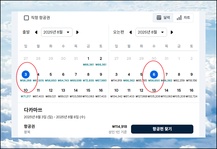 다카마쓰행 항공편을 예시로 한 번 살펴보겠습니다. 캘린더 화면에는 출발 날짜와 귀국 날짜에 따른 최저 가격들이 명확하게 표시되어 있어요. 개인의 여행 일정에 맞춰서 비용 부담이 적은 날짜를 고르시면 됩니다. 제가 검색해본 결과로는 왕복 비행기표가 12만 6천 원 정도였네요.