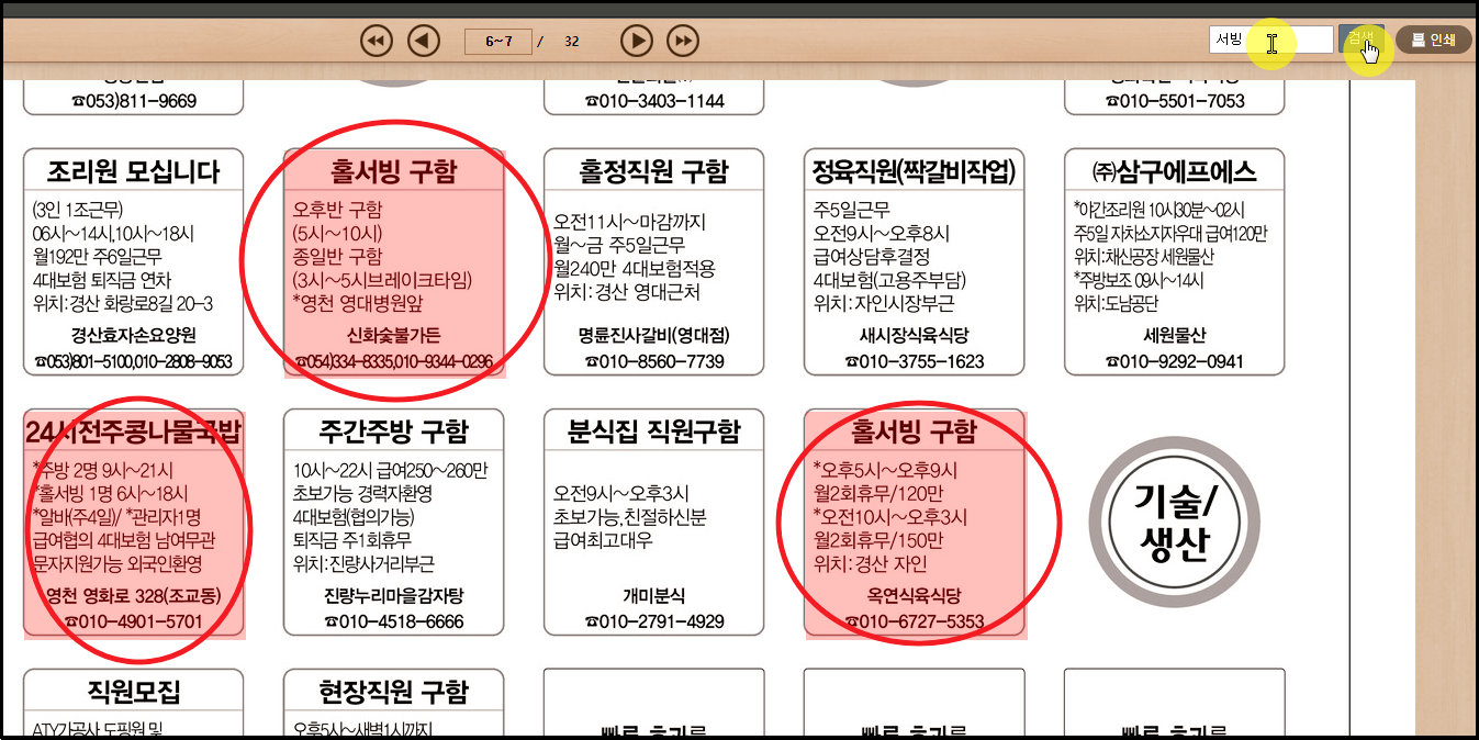 여기에 찾고 싶은 정보에 들어가는 키워드를 하나 입력한 후 [검색] 버튼을 클릭해 보세요. 저는 "서빙"을 입력해 보았는데요. 이에 따라 위와 같이 빨간색으로 하이라이트 표시가 되는 것을 확인할 수 있습니다.