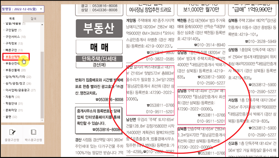 ▲ 좌측에 있는 목록에서 "부동산 매매"를 클릭해 볼게요. 이렇게 하면 우측에 있는 대구 교차로 신문 화면에서 빨간 박스로 부동산 매매에 대한 항목에 표시가 되는 것을 알 수 있습니다.