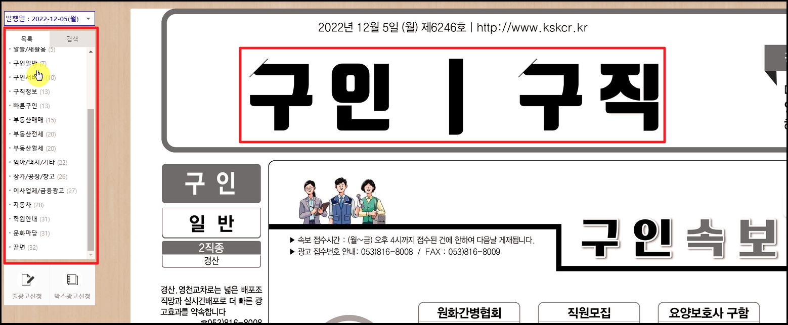 종이신문을 그대로 인터넷에 옮겨 놓았다고 보면 되는데요. 좌측에 있는 메뉴에서 원하는 정보에 관련된 메뉴를 선택해 보세요. 구인일반, 구인서비스, 구직정보, 빠른구인, 부동산매매, 부동산 전세, 자동차, 학원안내, 문화마당 등 다양한 메뉴가 마련되어 있네요.