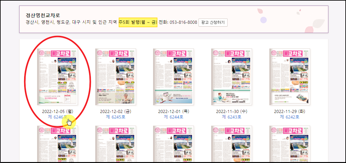 ▲ 경산영천 교차로를 선택했습니다. 일주일에 5회 발행이 된다고 하는데요. 광고 신청을 위한 연락처도 보이네요.