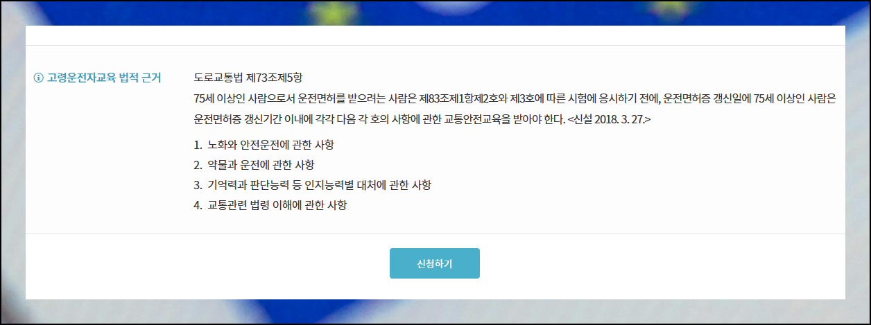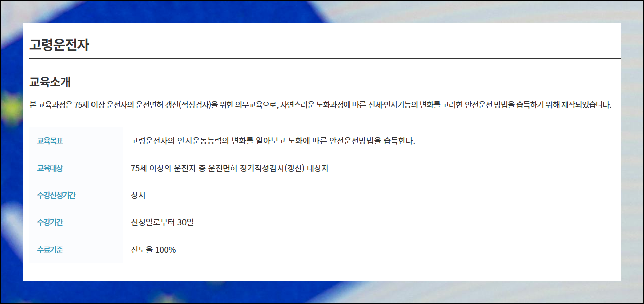 교육과정의 주요 사항들을 반드시 점검해 주세요. 이 과정은 75세이상 운전자들이 의무적으로 이수해야 하는 강의입니다. 수강 등록은 언제든 할 수 있고요, 등록일부터 30일간 수강이 가능해요. 진도율 100퍼센트 달성해야만 수료 인정을 받을 수 있어요.