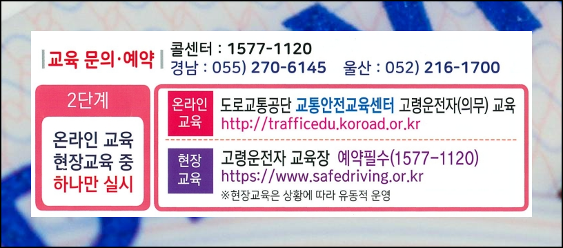 교육 과정에는 온라인과 현장 수업 두 종류가 있어요. 이 중에서 한 가지만 선택해서 받으시면 됩니다. 75세이상 분들은 고령운전자 교육장에 예약하고, 직접 방문하는 번거로움을 피하려면 온라인 강의를 추천드려요. 컴퓨터 사용이 어려우시다면 자녀분들이나 손자손녀에게 도움을 요청해 보세요.