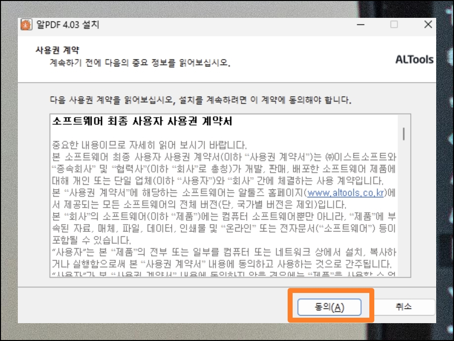 받아온 설치 파일을 더블클릭하면 먼저 약관 동의 화면이 등장해요. 내용을 확인한 후 동의 버튼을 선택하고, 이어서 시작 버튼을 누르면 무료 문서 편집 프로그램이 자동으로 컴퓨터에 설치되기 시작합니다.
