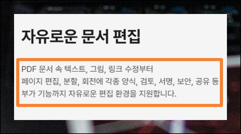 원본 파일이 없어도 pdf 문서의 텍스트를 바꾸거나 이미지를 삽입하는 것이 가능합니다. 또한 워터마크나 머리글 같은 전문적인 기능들도 비용 부담 없이 활용하실 수 있어요. 복잡한 프로그램 조작법을 익히지 않아도 직관적인 인터페이스로 누구나 쉽게 사용할 수 있도록 설계되어 있습니다.