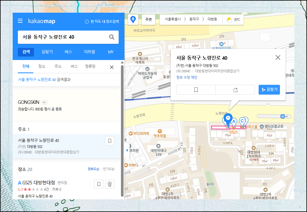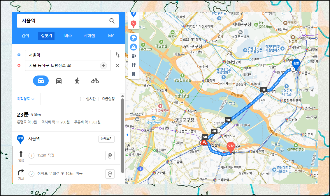 원하는 장소를 찾았다면 이제 어떻게 갈지 계획을 세워보죠. 시작 지점만 설정하면 최적의 이동 경로를 자동으로 계산해줍니다. 서울역에서 노량진로40길까지의 위치찾기를 해보니 대중교통으로 약 23분 소요되는군요. 이용할 버스 노선까지 상세하게 표시되어서 실제 이동할 때 헤매지 않고 찾아갈 수 있어요.
