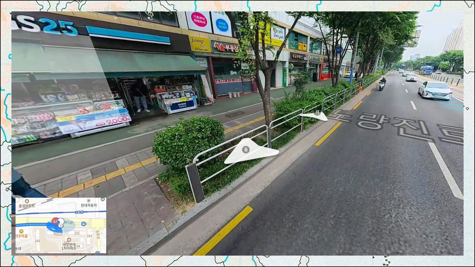 평면 지도만으로는 실제 현장의 모습을 상상하기 어려울 때가 있죠. 이럴 때는 로드뷰 기능이 정말 도움이 됩니다. 우측 상단의 로드뷰 아이콘을 클릭한 후 원하는 지점으로 드래그해서 놓으면 되어요. 그러면 실제 거리 풍경을 생생하게 미리 볼 수 있습니다.