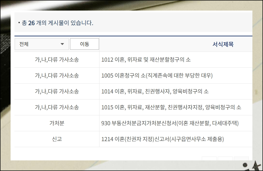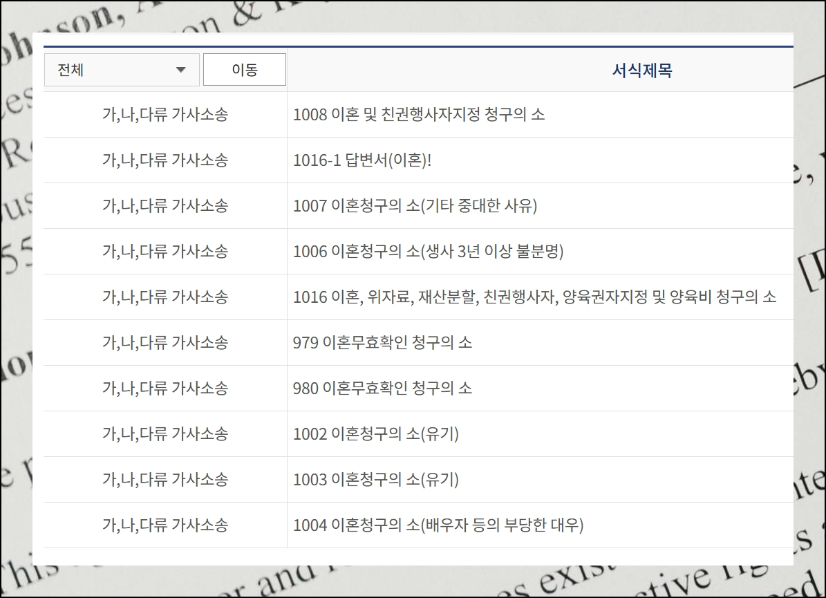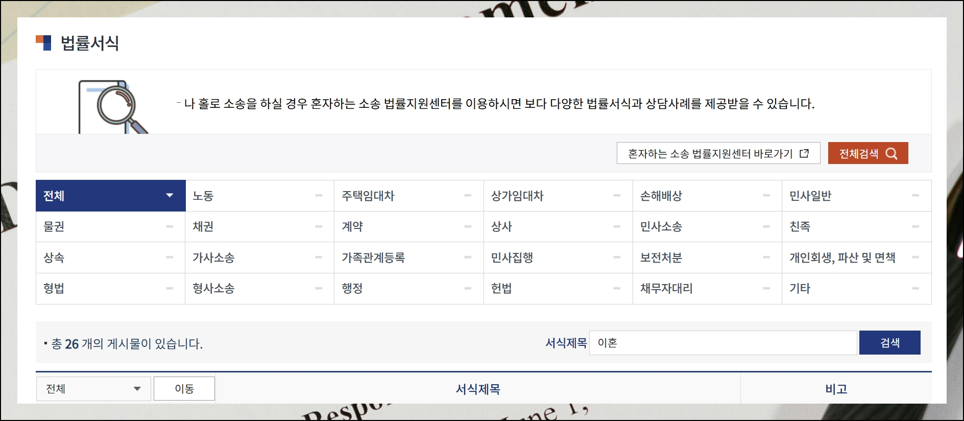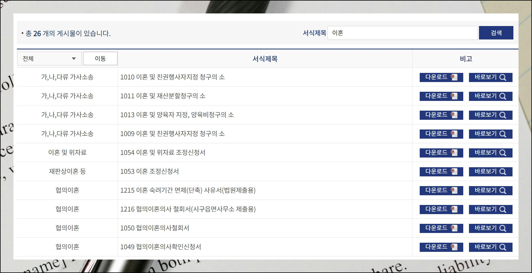 2,000개가 넘을 정도로 많은 수의 법률 양식이 준비되어 있는 자료실이 화면에 나타나게 되는데요. 이 중에서 이혼사류 관련 문서를 찾으시려면 검색창에서 서식제목 부분에 "이혼"이라고 입력하고 검색해보시면 됩니다.